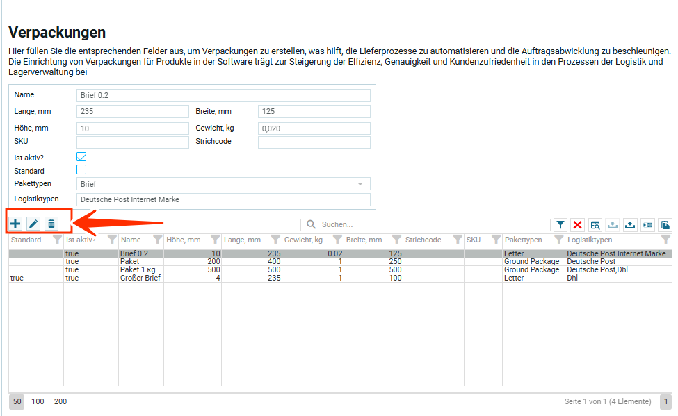 Кнопка отвечает за создание объектов в таблице. Нажми на кнопку и появится модальное окно для создания упаковки.