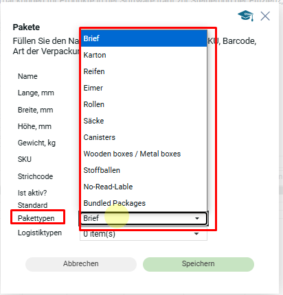 Типы посылок доступные в системе будут видны в выпадающем списке: