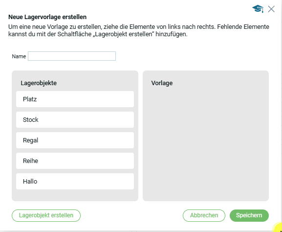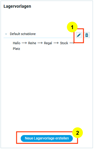 (1) . Для создания нового шаблона – нажать на синюю кнопку „Создать новый шаблон склада“ (2).