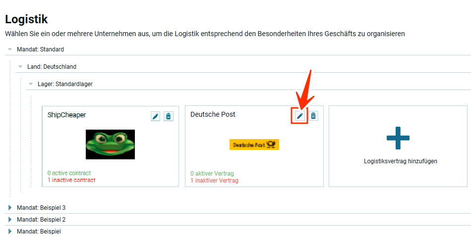Если нажать на кнопку в определенной логистике, откроется второй уровень настроек.Контракты.