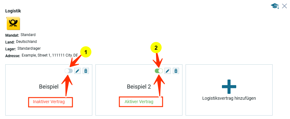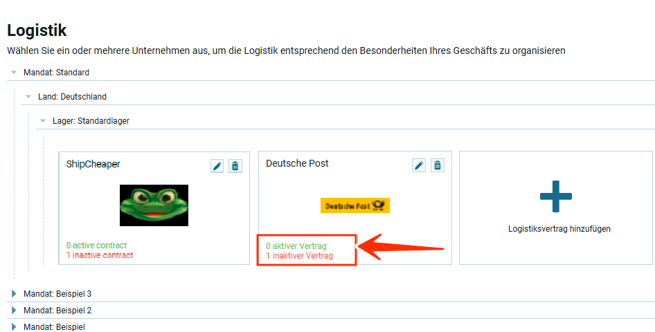 В данной логистике мы видим один контракт активный, другой нет. Если вернуться к первому уровню настроек логистики, можно увидеть, что у данного типа логистики под логотипом будет отображено количество активных и неактивных контрактов: