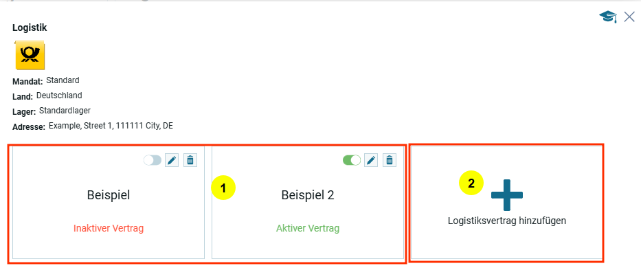 В этой области находятся списки уже созданных контрактов (1) и отдельный блок (2) для подключения нового контракта. У пользователя может быть подключено несколько контрактов к одной логистике, в зависимости от логистических продуктов и методов доставки.