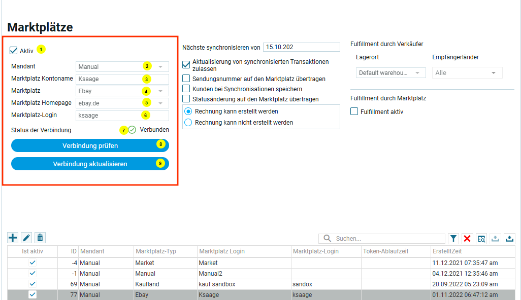 Если флажок снят, торговая площадка считается неактивной: она не будет доступна для синхронизации с приложением;
