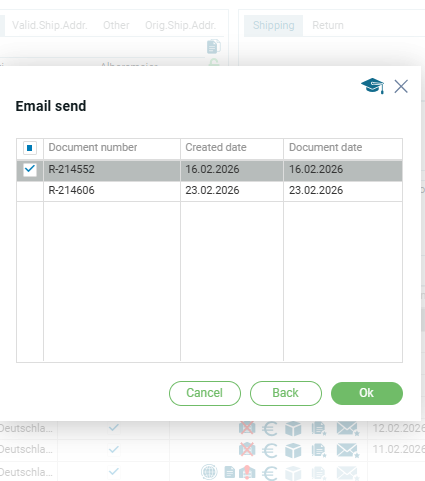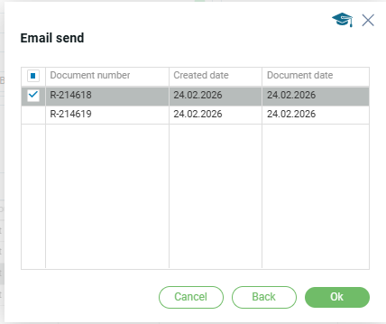 - Выбран один заказ с созданными документами, например счет-фактура, более одного экземпляра. Открывается после подтверждения отправки в модальном окне №1.