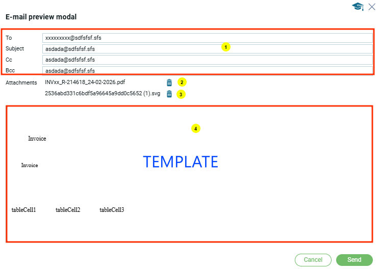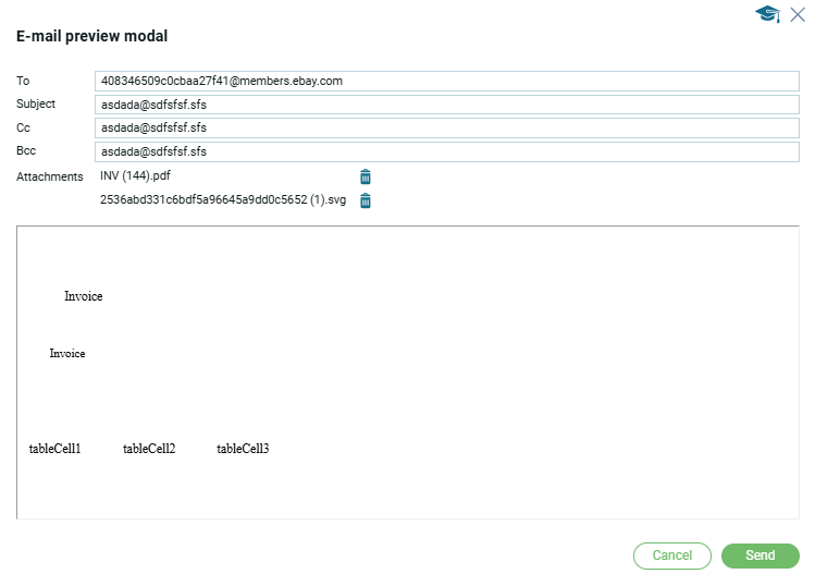 - Модальное окно для предварительного предпросмотра E-mail перед отправкой. Открывается после 1 (2) модального окно при условии если в настройках Е-Mail шаблонов выбрана функция предварительного просмотра. Если данная функция неактивна, то E-Mail отправляется без предварительного просмотра.