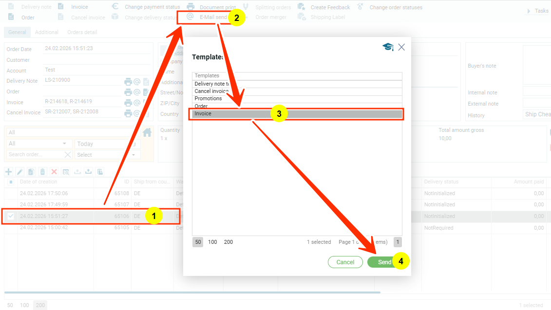 Выбираем заказ (1) нажимаем на функцию “E-Mail отправить” (2) выбираем документ “счет-фактура” (3), нажимаем “Отправить” (4):