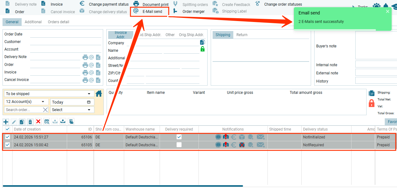 Во втором случае отправка документов будет недоступна. При попытке отправить E-Mail появится красная нотификация, в которой будет сообщаться о том, что для определенных заказов не созданы документы.