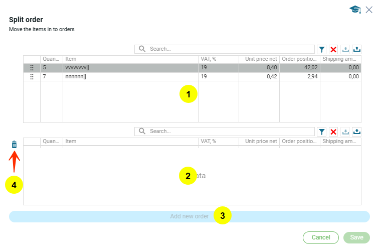 - Иконка удалить – удаляет пустую область, если из нее все товары перемещны в другой заказ;