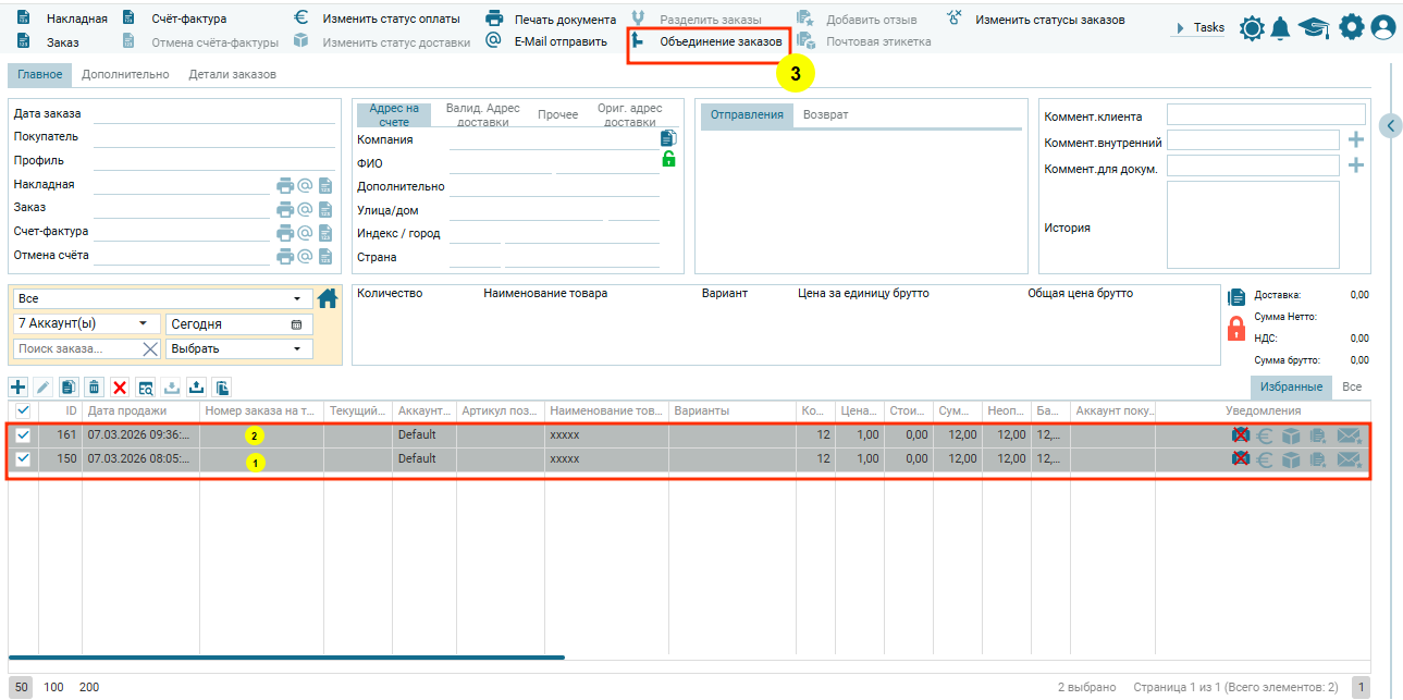 Для того что бы воспользоваться функцией “Объединение заказов“, нужно выбрать заказы (1+2) в таблице и кликнуть “Оъединить заказы” в функциональном меню (3).
