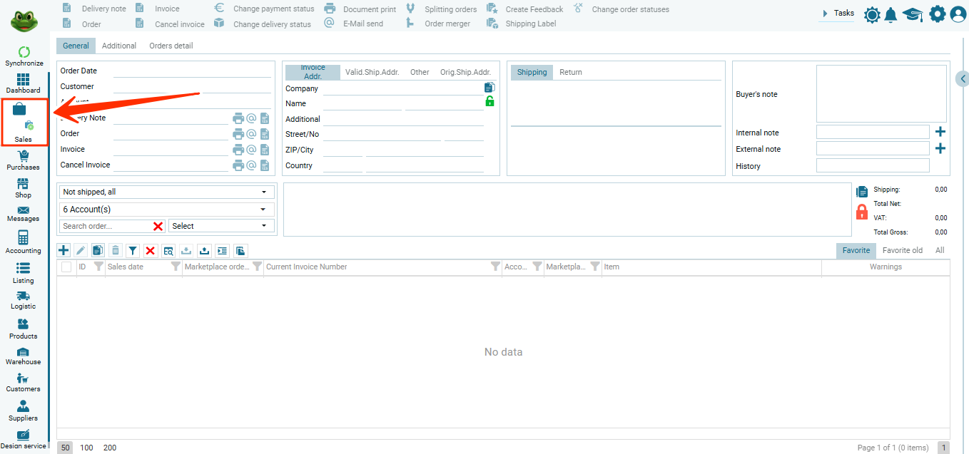 Слева от рабочего пространства есть меню вкладок. Вкладка “Продажи” легко переносит пользователя в удобный интерфейс управления заказами.