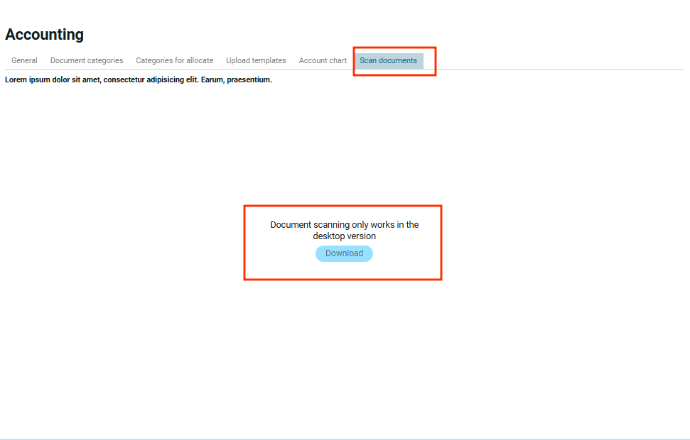 В браузерной версии ERP.BillOrga функция сканирования документов не поддерживается, потому что веб-приложения не имеют прямого доступа к локальным устройствам, таким как сканеры (в целях безопасности и ограничений браузера). Поэтому, во вкладке “Сканирование документов” ты увидишь кнопку “Скачать”.