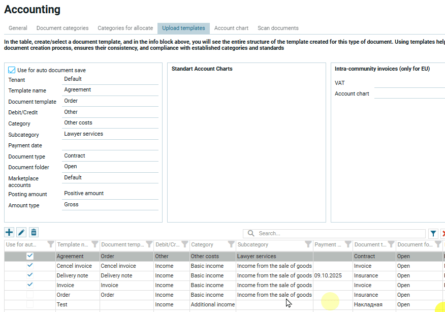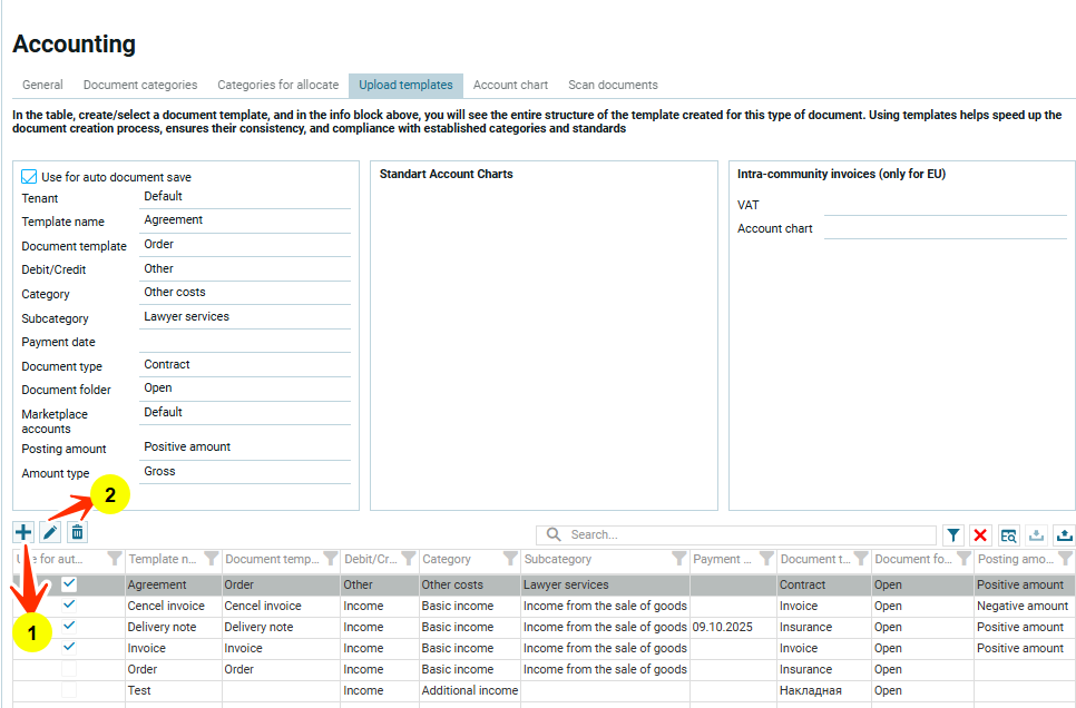 Перейти в “Настройки“, в списке настроек выбрать пункт “Бухгалтерия -> Шаблоны для загрузок“. Откроется интерфейс для работы с настройками шаблонов.