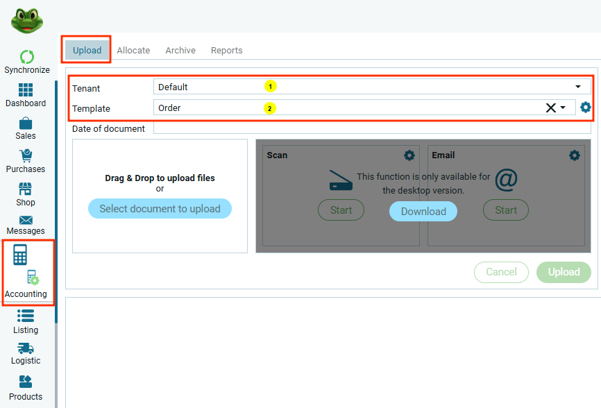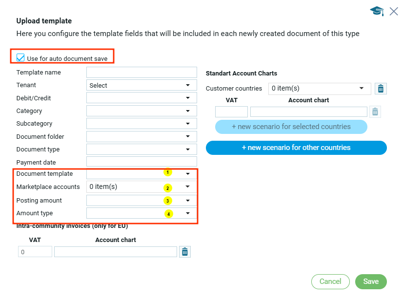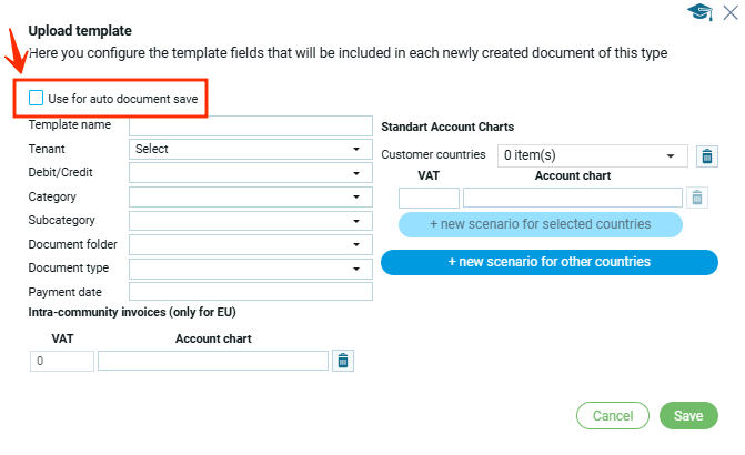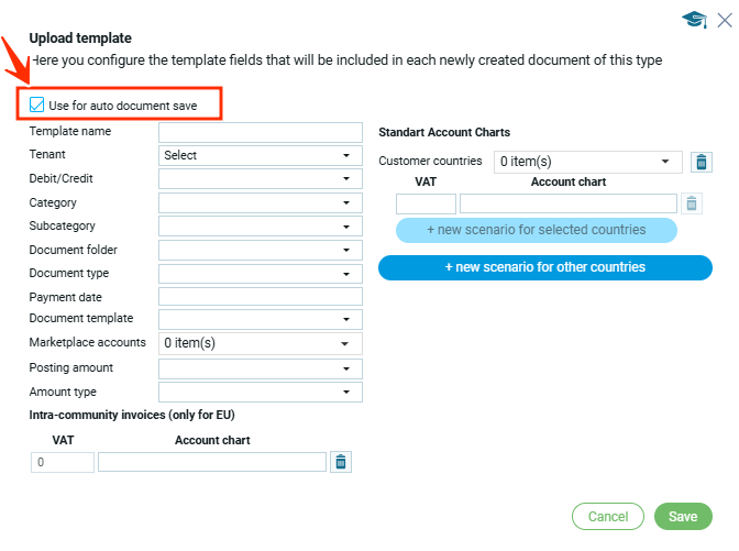 Если чекбокс неактивен, загрузка документа в систему осуществляется вручную через вкладку “Бухгалтерия → Загрузка“.