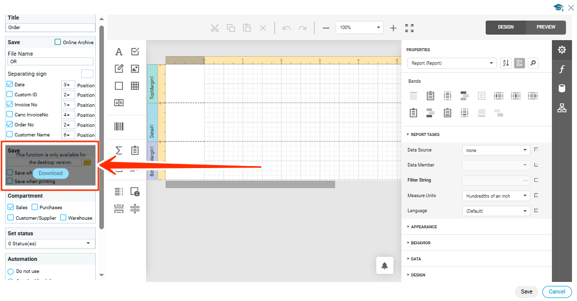 Настройки печати в веб версии заблокированы! Есть ссылка на десктопную версию.