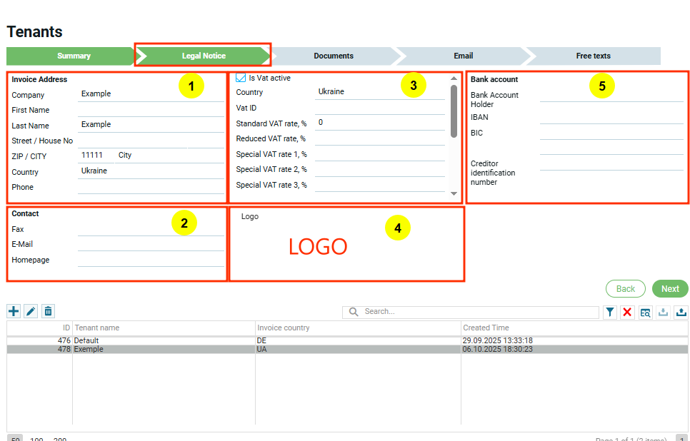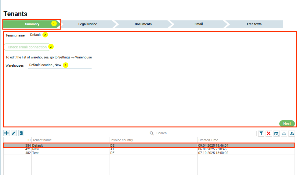 Организация в таблице «Example«. Первая вкладка «Основная информация» (1). В обзорном окне отображается название Организации (2), кнопка «Проверить подключение» (3) — проверка настроек электронной почты и информация по складам привязанным к Организации(4).