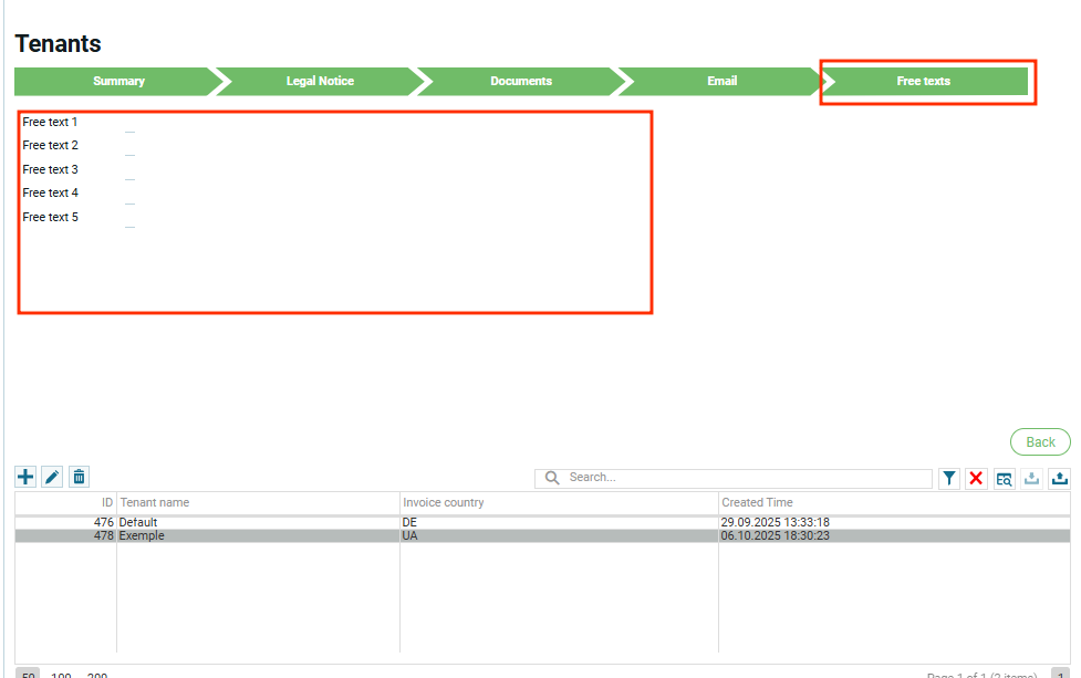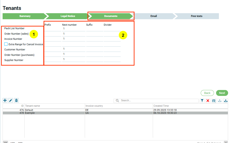 Третья вкладка “Документы”. В обзорном окне отображается список объектов (1), которые нумеруются в системе и алфавитно-цифровая нумерация (2), которую настраивает сам пользователь.