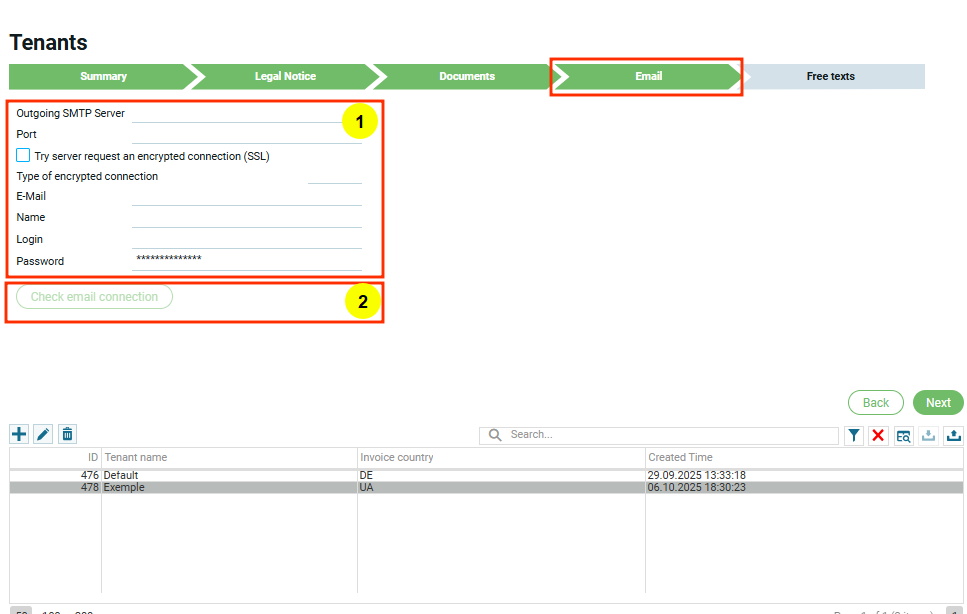 Четвертая вкладка “Электронная почта”. В обзорном окне отображаются настройки электронной почты и кнопка “Проверка подключения”.