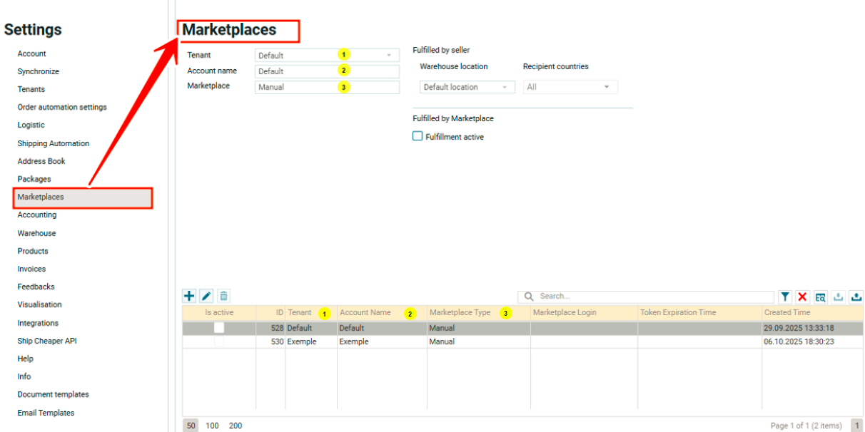 Перейти в настройки, вкладка “Торговые площадки” – в таблице “Default” мануальный аккаунт. Одним из основных параметров в аккаунте торговой площадки является Организация. В данном случае мануальный аккаунт (торговая площадка (3)) с названием “Default” (2) – организация “Default” (1).