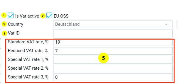 - Ставки НДС стандартные и льготные – применяемая ставка НДС. Значения ставок заполняются автоматически после выбора пользователем страны, где он зарегистрирован в качестве плательщика НДС.