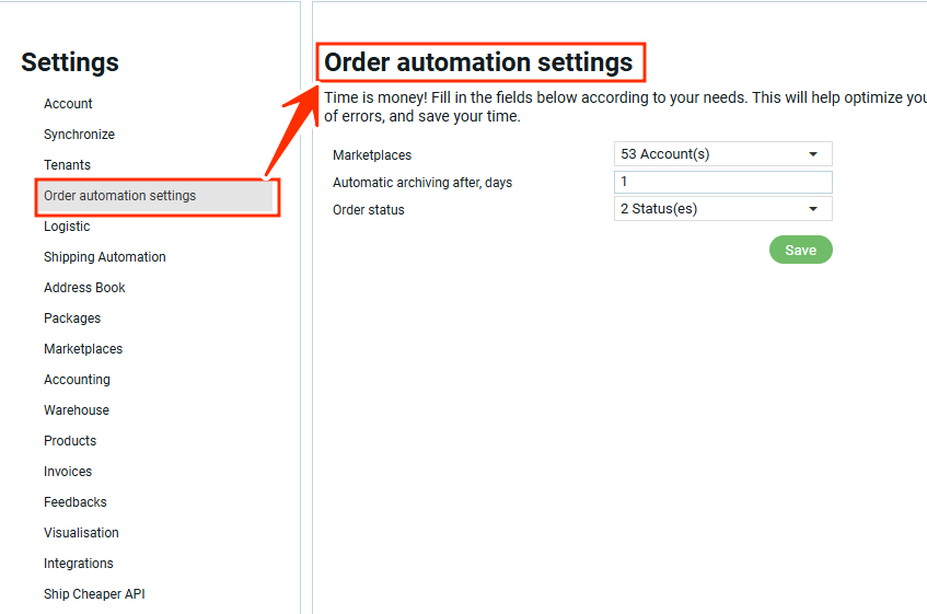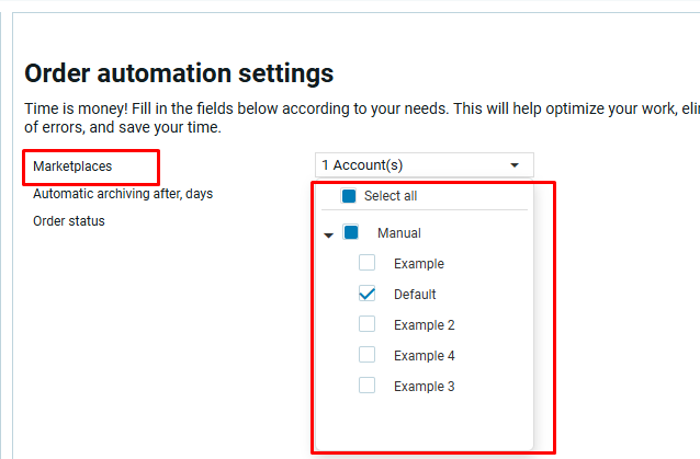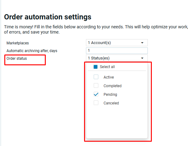 2. Автоматическое архивирование через (дни) — количество дней, по истечении которых заказы с определённым статусом и с выбранных торговых площадок будут скрыты из табличной части.