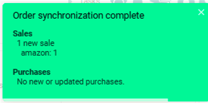 В случае выбора способа “Вручную“, после осуществления синхронизации появляется сообщение об успешной синхронизации с количеством новых и обновленных покупок и продаж + во вкладках продажи / покупки и на кнопке “Обновить” появляется красный кружок с количеством заказов, которые требуют загрузки / обновления. После нажатия на кнопку “Обновить” заказы обновляются в системе.