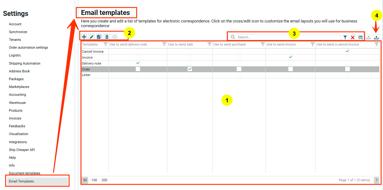 На скрине выделено 4 основных пункта, нумерация которых соответствуют пунктам в сайдбаре справа. Каждый пункт содержит более подробное описание настроек. 5-ый пункт – создание / редактирование шаблонов в модальных окнах.