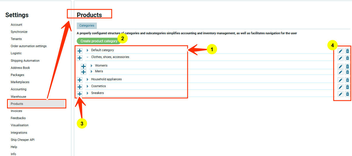 Дерево категорий и подкатегорий продуктов пользователь создает самостоятельно в соответствии с классификацией своего товара.