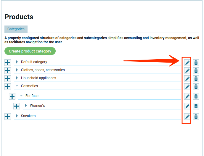 Для редактирования категории нужно нажать на кнопку справа от названия категории.