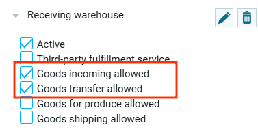 - Поступление товаров разрешено — зона может использоваться для приёма товаров на склад;