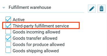 - Сторонний сервис выполнения – это означает, что обработкой заказов (хранение, упаковка, доставка) занимается не ваш склад, а внешний поставщик услуг, например маркетплейсы. Т.е. выбор этого параметра предусмотрен для складов на стороне маркетплейсов;