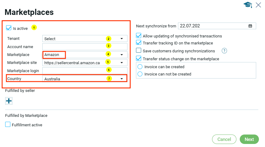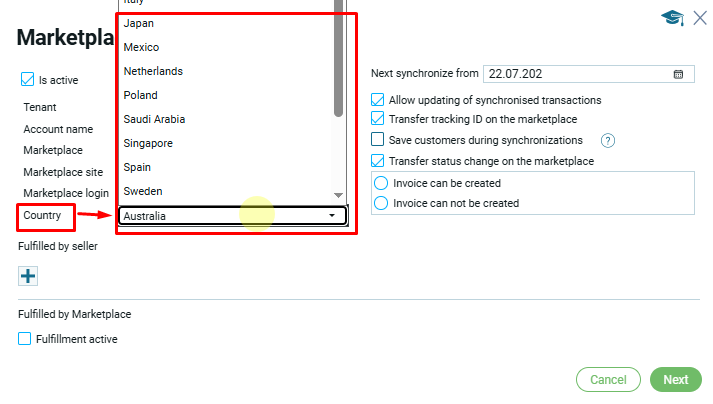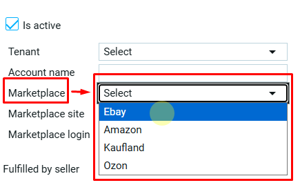Страна (7) – страна ведения бизнеса с данной торговой площадки. Это поле появляется только для торговых плащадок Amazon и Kaufland. Страну выбирают из выпадающего списка.