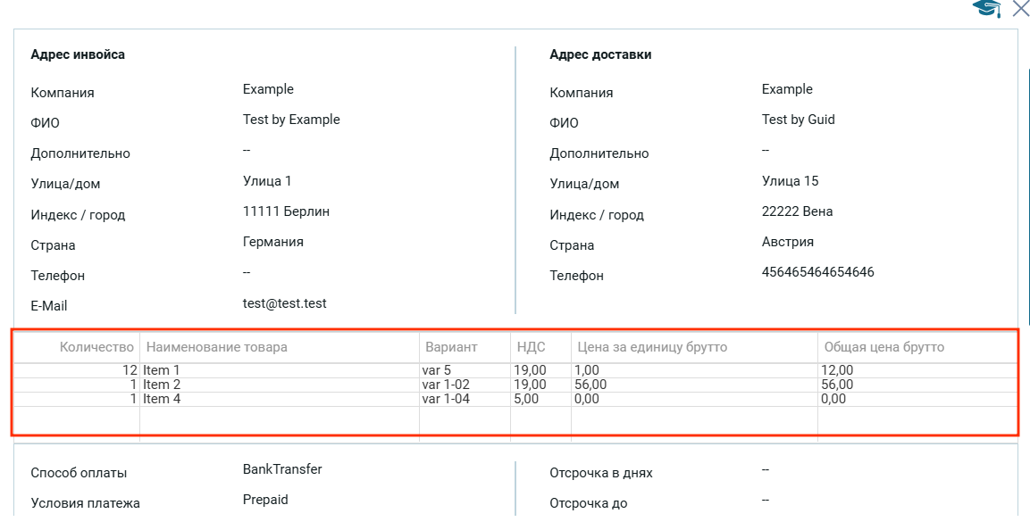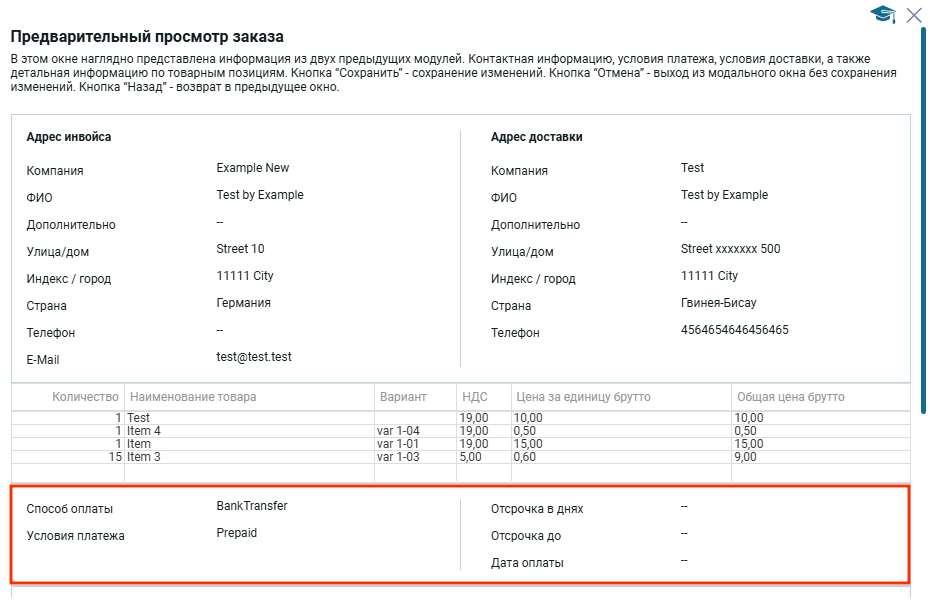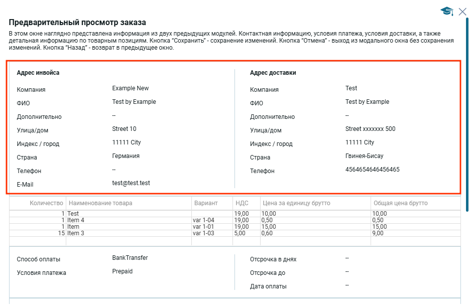 Вверху отображается адрес инвойса и адрес доставки, которые заполняются в первом модальном окне основная информация