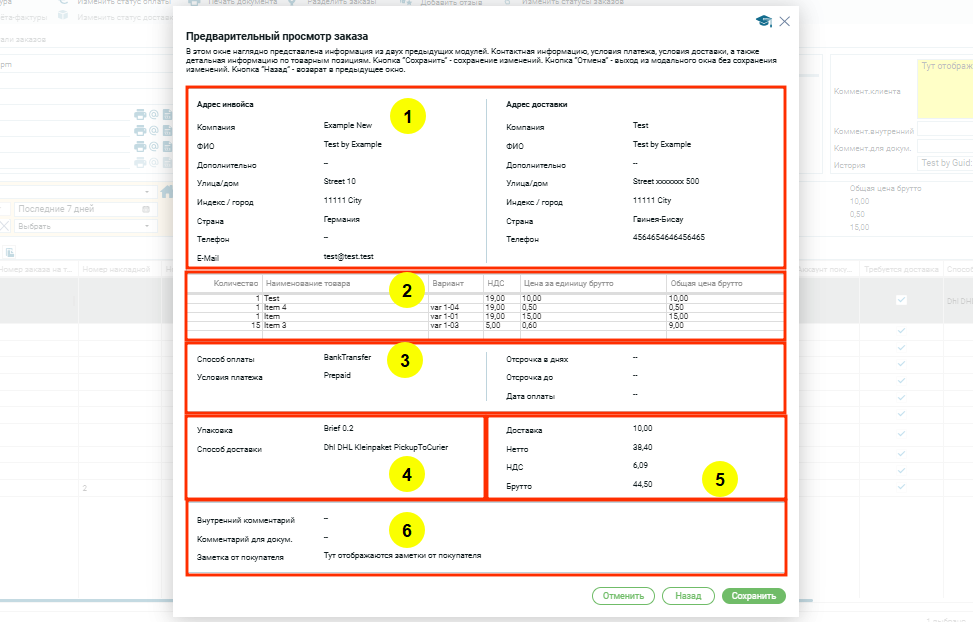 После заполнения основной информации и добавления товаров в список заказа пользователь попадает в окно предварительного просмотра.