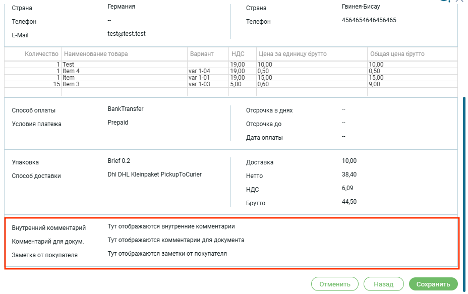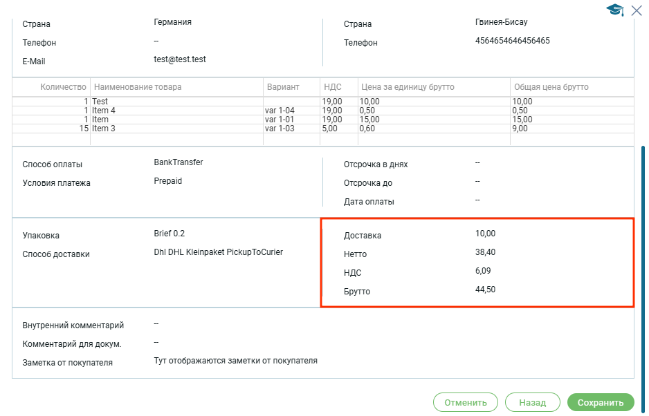 Рядом с доставкой расположена обобщающая информация по сумме заказа: Нетто, Брутто, НДС и стоимость доставки.