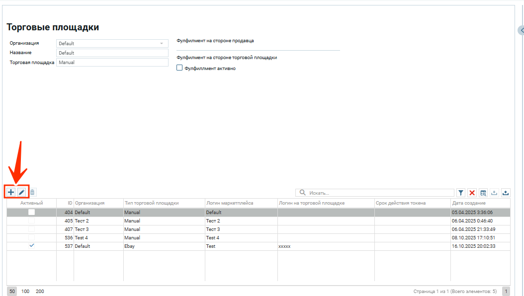 Мануальный тип торговой площадки создается автоматически одновременно с созданием организаций. Для этого типа площадки предусмотрено только редактирование в модальном окне.